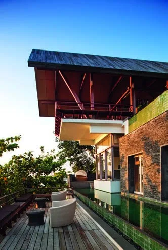 A second staircase descends from the pool deck to another master bedroom suite, while another flight of stairs ascends to two bed- rooms above. In this way, Bedmar has ingeniously created a residence that, not unlike a traditional Thai house, permits two or three generations to occupy the dwelling and to share core activities on a communal deck while maintaining a degree of privacy.