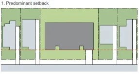 • use a setback range where the desired character is for variation within overall consistency, or where subdivision is at an angle to the street